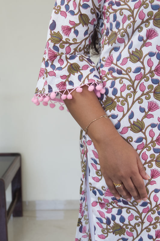 135 White Printed kurta with Pom-pom lace and bell sleeves