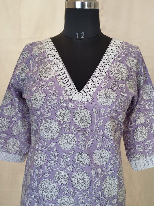 48 Lavender Colour Printed Kurta With Lace Detailing