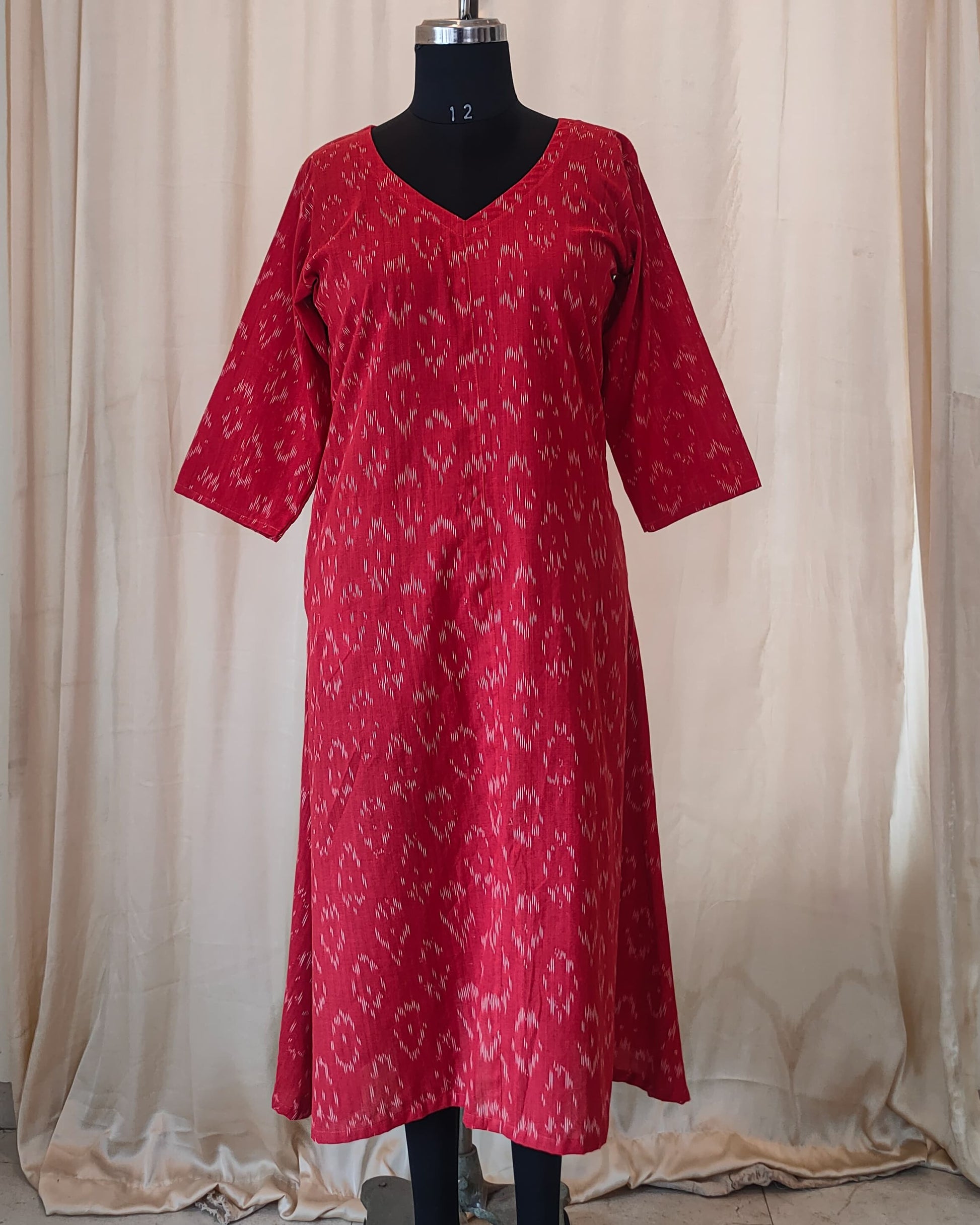 Embrace vibrant tradition with this stunning orangy-red Ikkat A-line kurta. Its graceful silhouette and handwoven design make it an ideal choice for everyday ethnic wear. Style it with leggings or palazzos for a chic yet cultural look.