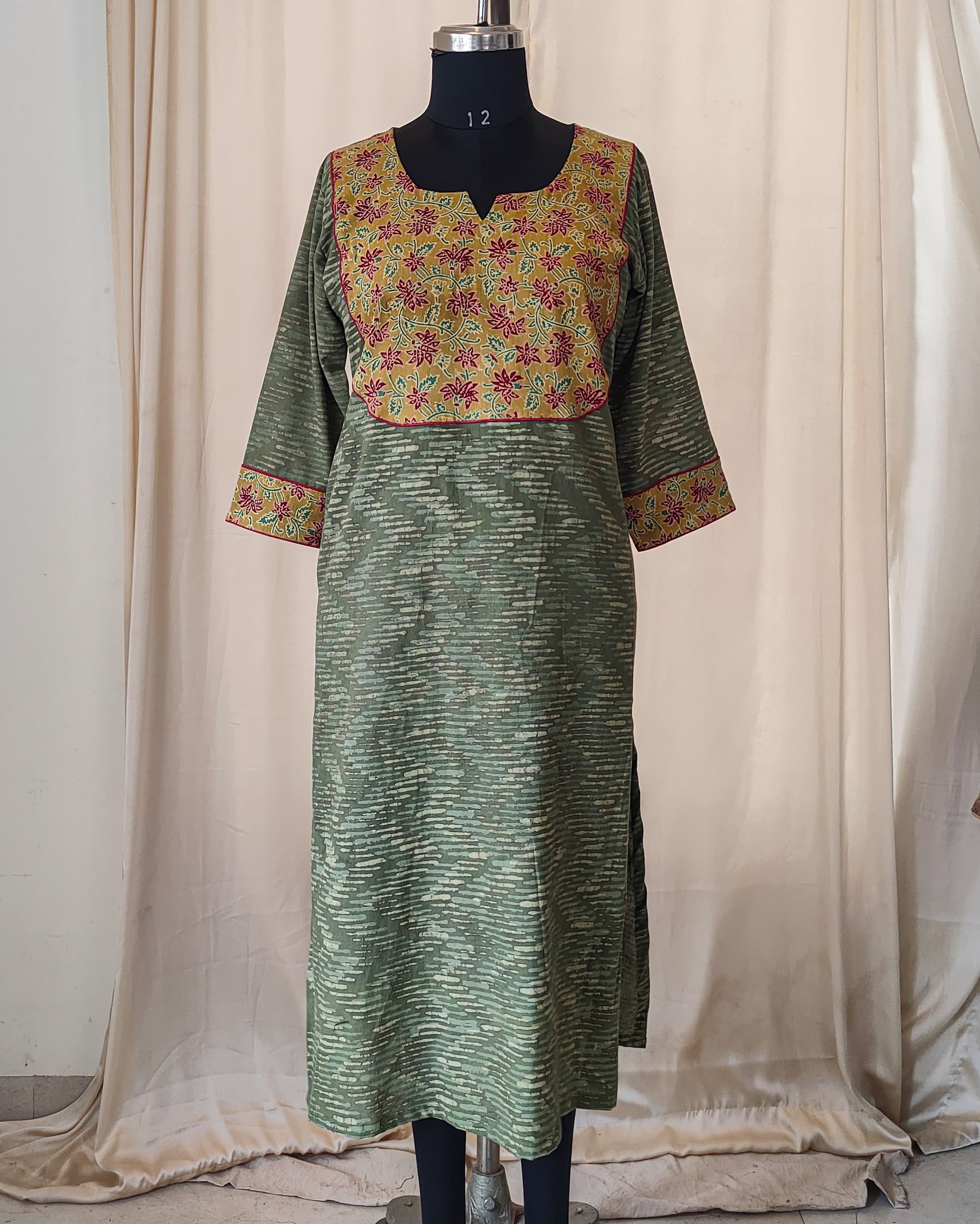 174 An Olive Green Kurta with Ajrakh Yoke Patch