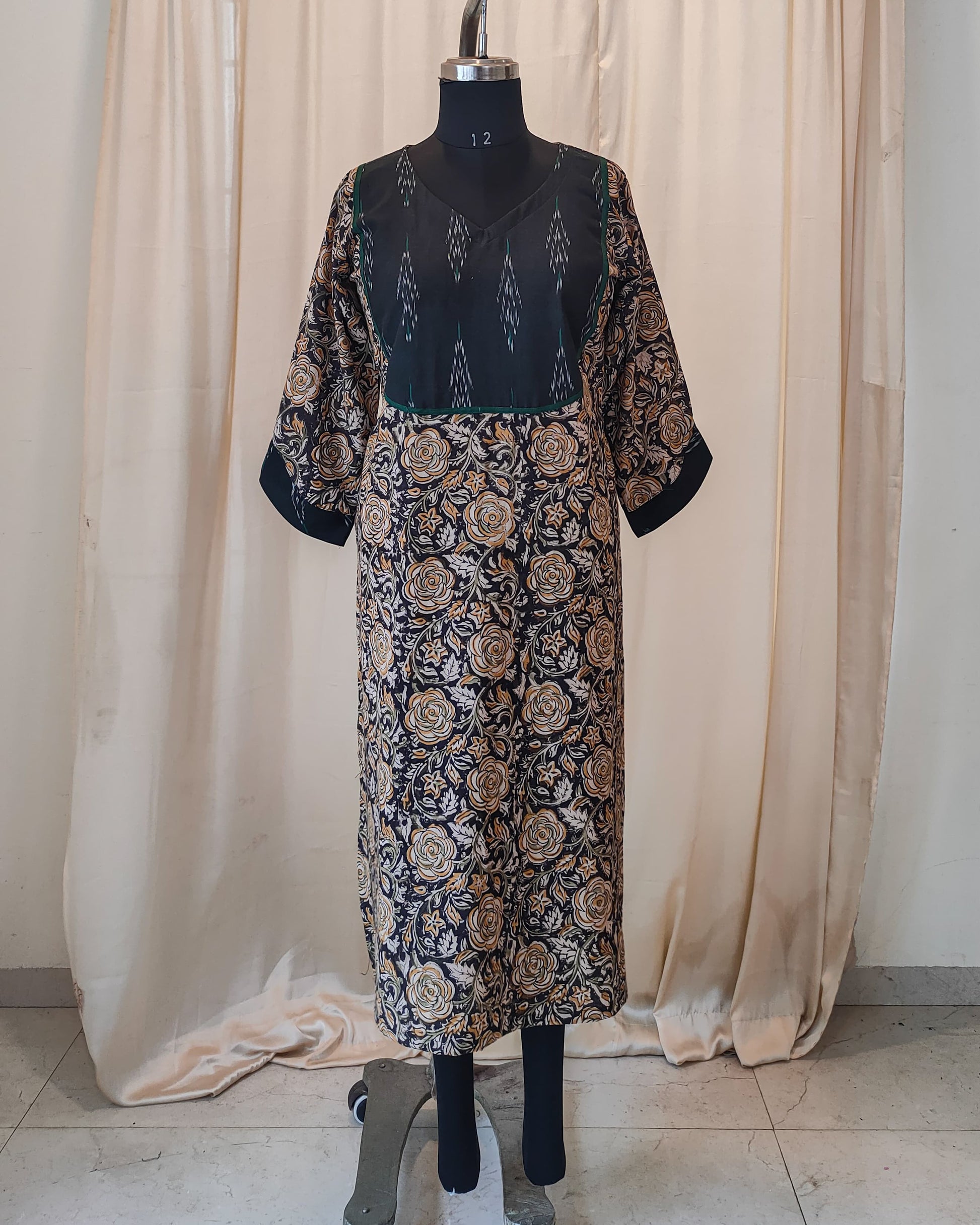 Unveil a statement of refined heritage with this exquisite Black Kalamkari Kurta, a beautiful piece of handloom fusion wear that celebrates India's most cherished textile arts. The rich pure cotton body features intricate, earthy Kalamkari block prints, creating a timeless and elegant backdrop. This sophistication is boldly accented by a vibrant, geometrically patterned Ikkat yoke patch at the neckline, transforming the traditional look into a striking designer cotton kurta. With its flattering long straight fit and breathable fabric, this kurti effortlessly bridges the gap between sophisticated ethnic office wear and elegant festive Indian attire. This is the ultimate traditional Indian kurti for the woman who demands both artistic quality and contemporary style.