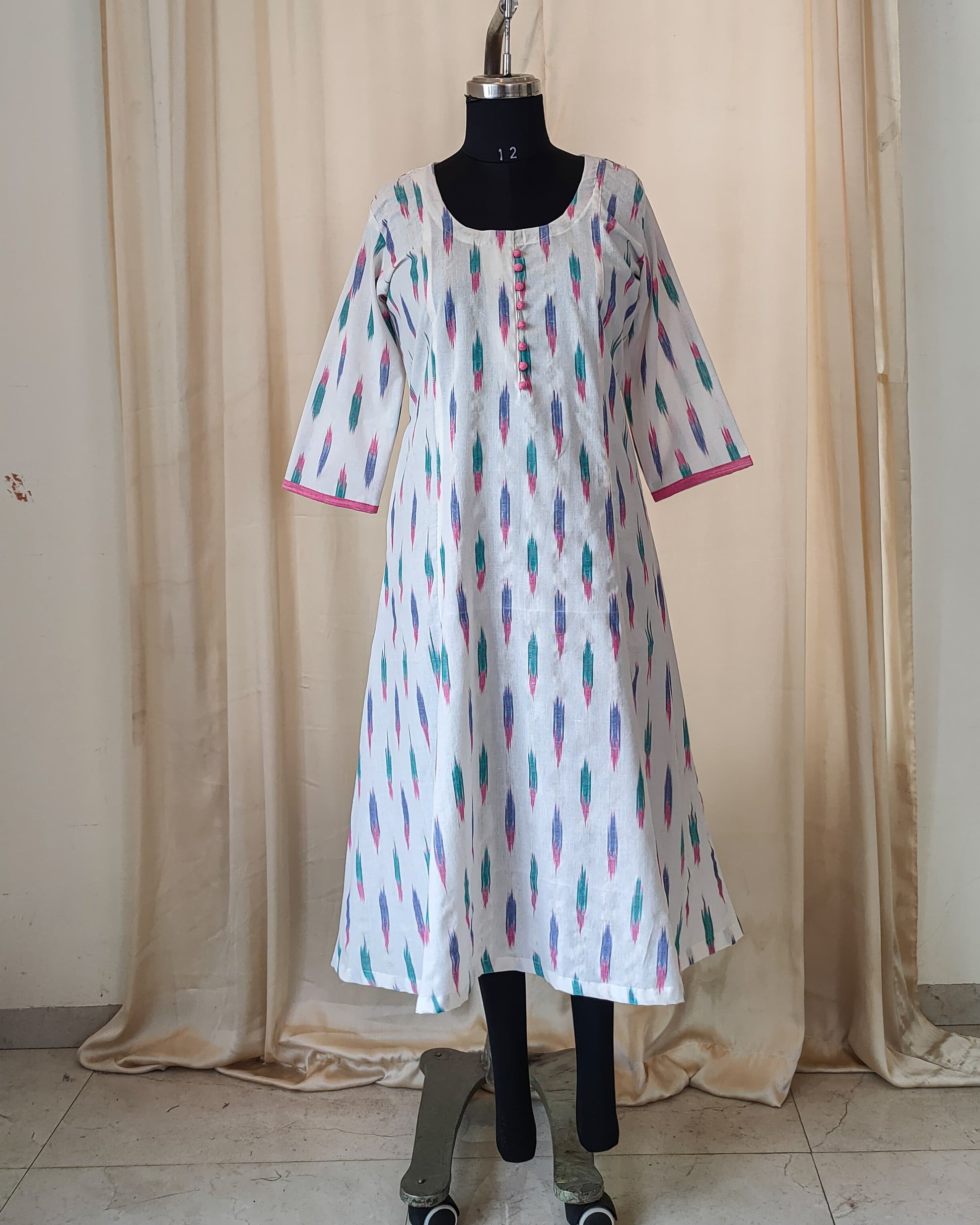 Make a statement with this White Ikkat Fit n Flare Kurta, adorned with delicate pink potlis for a playful touch. The fit-and-flare silhouette flatters all body types, while the breathable cotton fabric makes it perfect for all-day wear. Its ikkat weave gives it a traditional yet modern appeal. Ideal for festive occasions, workwear, or casual dinners.