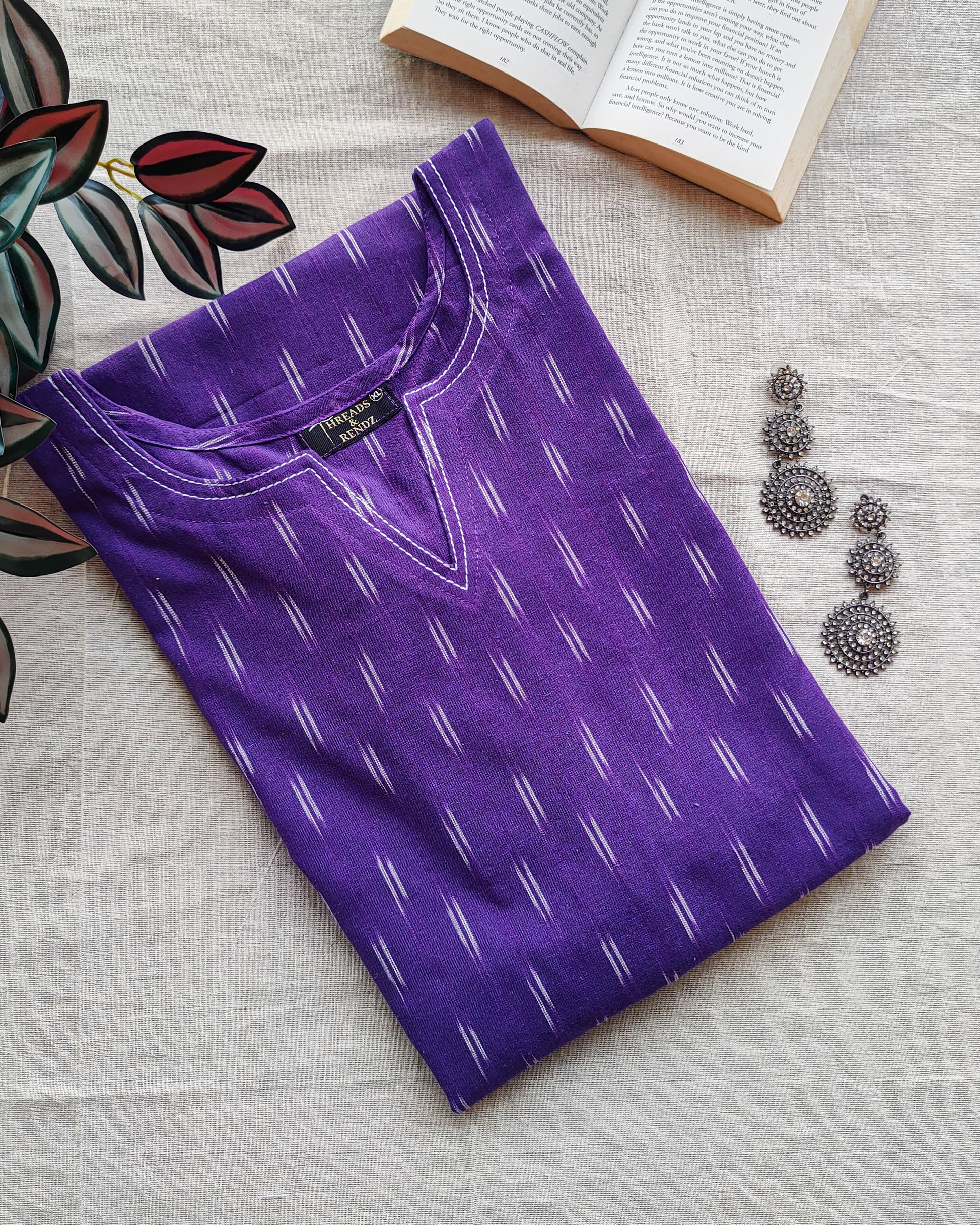 Add grace to your collection with this Purple Cotton Kurti, highlighted with a white ethnic print and a fancy neckline. Its deep color is balanced with airy fabric, making it wearable all day long. Perfect for work, casual outings, or small festive gatherings. The unique neckline design elevates its overall look, keeping it trendy yet traditional.