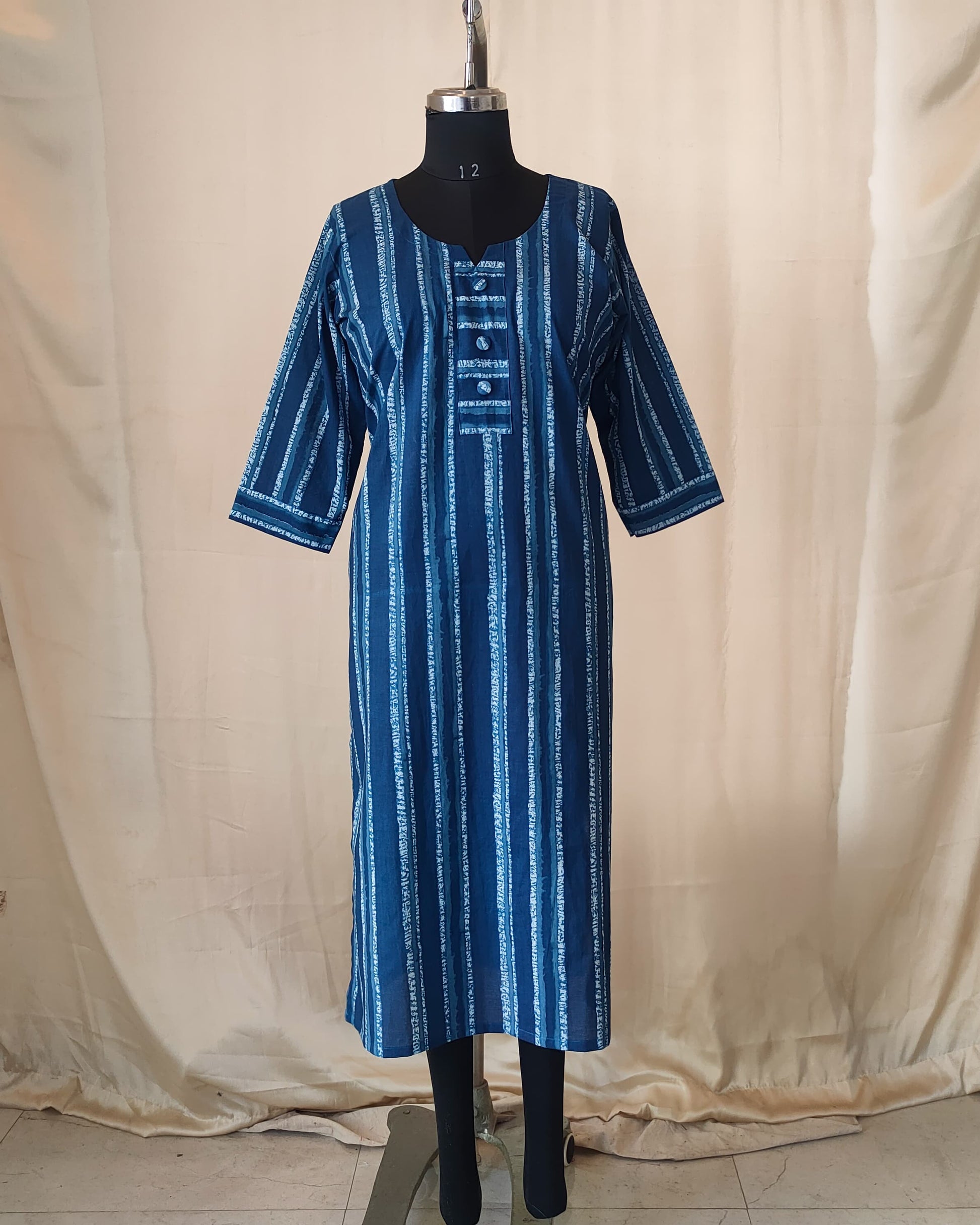 Step out in crisp style with this classic blue stripes straight kurta. The clean, vertical stripes create a lengthening and smart visual effect. Cut in a comfortable straight silhouette that flatters every body type. Perfectly versatile—dress it up with accessories or keep it simple for daily wear. A must-have addition for a sharp, polished, and effortlessly cool ethnic wardrobe.