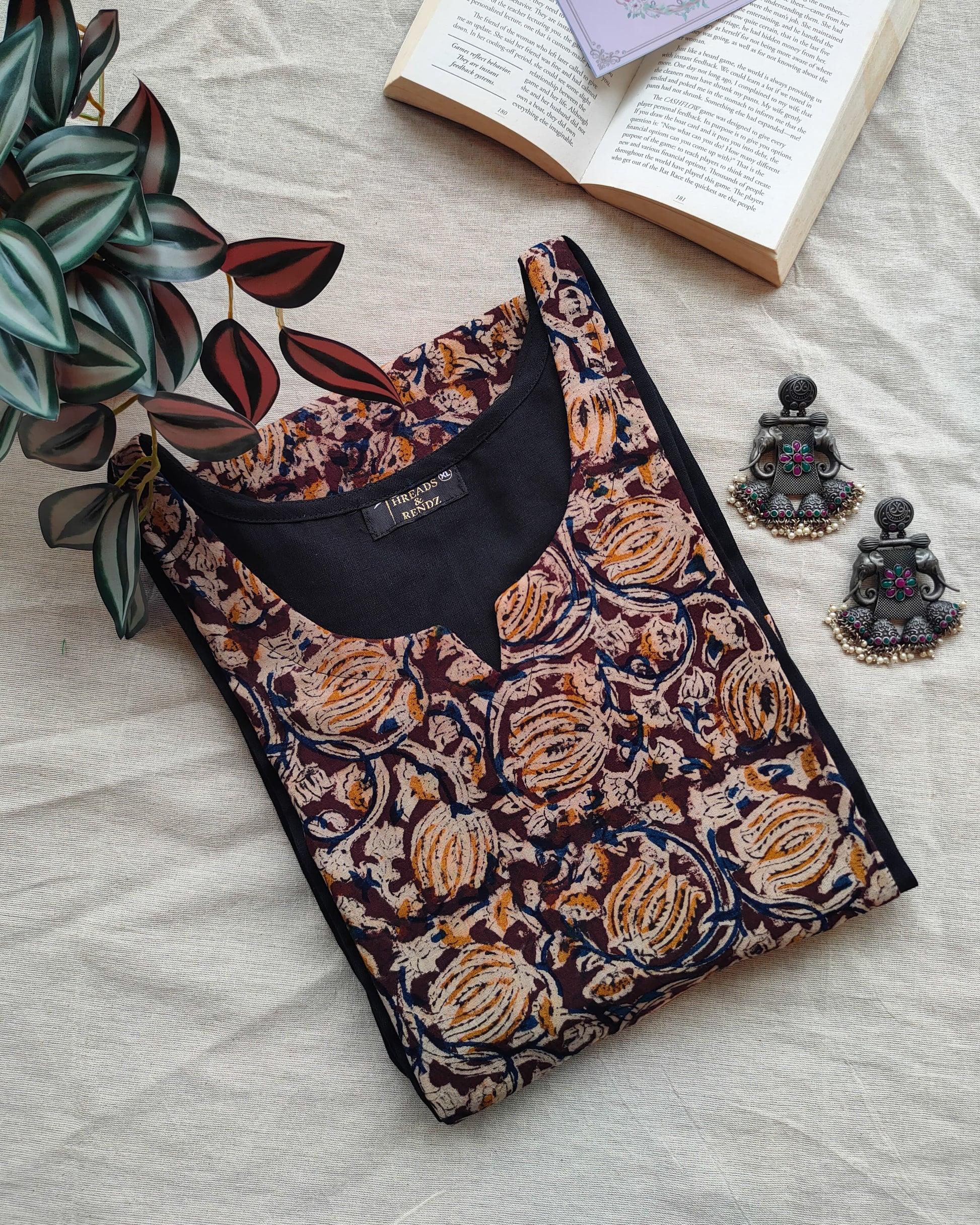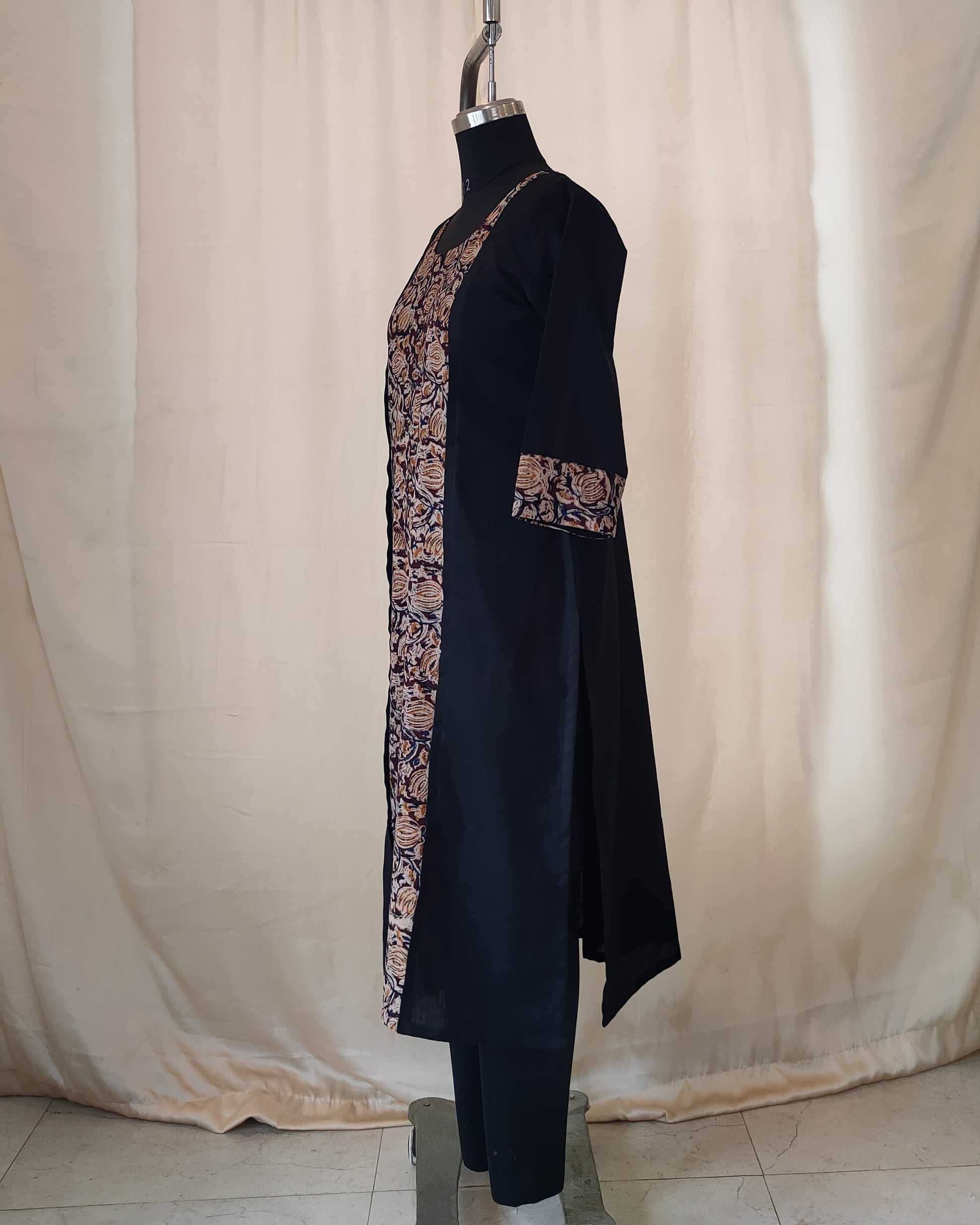 A sophisticated Black straight-cut cotton kurta featuring an exquisite Kalamkari patterned panel running down the front. The straight silhouette offers a clean, contemporary fit in a comfortable, breathable cotton fabric. This piece perfectly balances modern monochrome with a traditional touch, making it ideal for professional settings or cultural events. The contrasting Kalamkari panel provides a striking focal point and a subtle storytelling element.