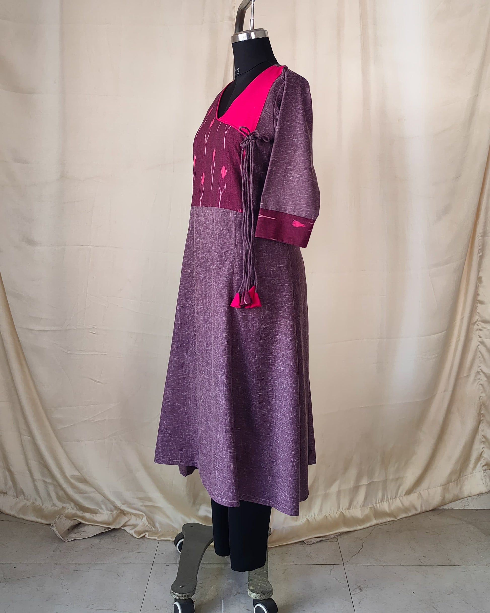 203 Purple soft cotton kurta with ikkat overlap pattern and tassels