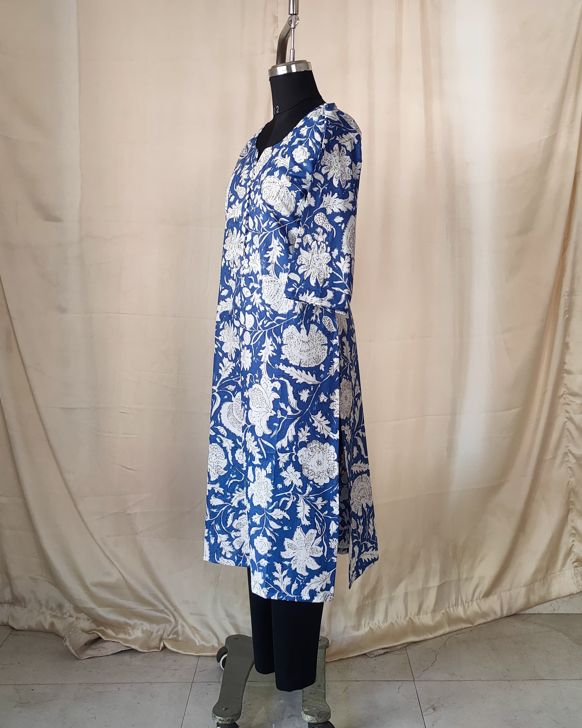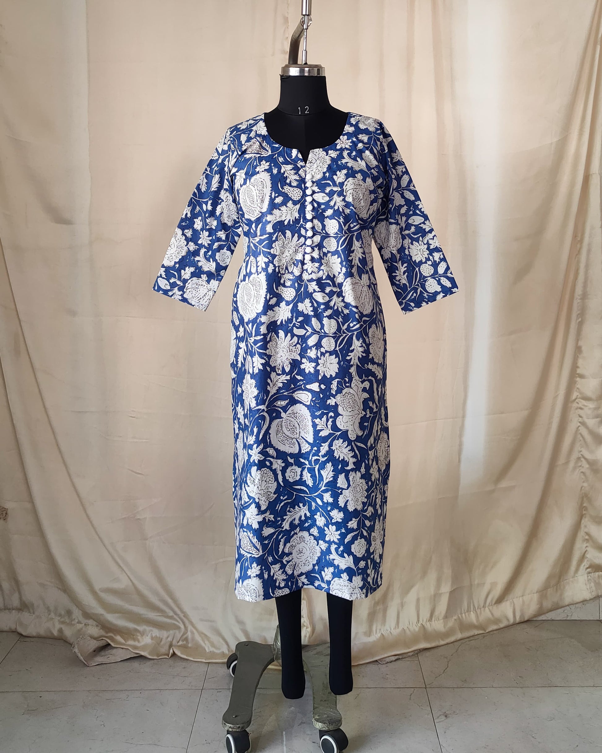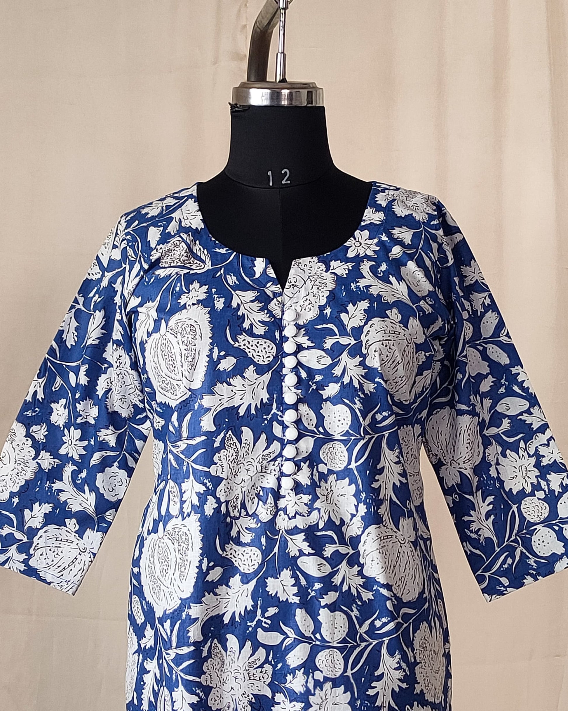 205 Blue and white printed kurta with white buttons